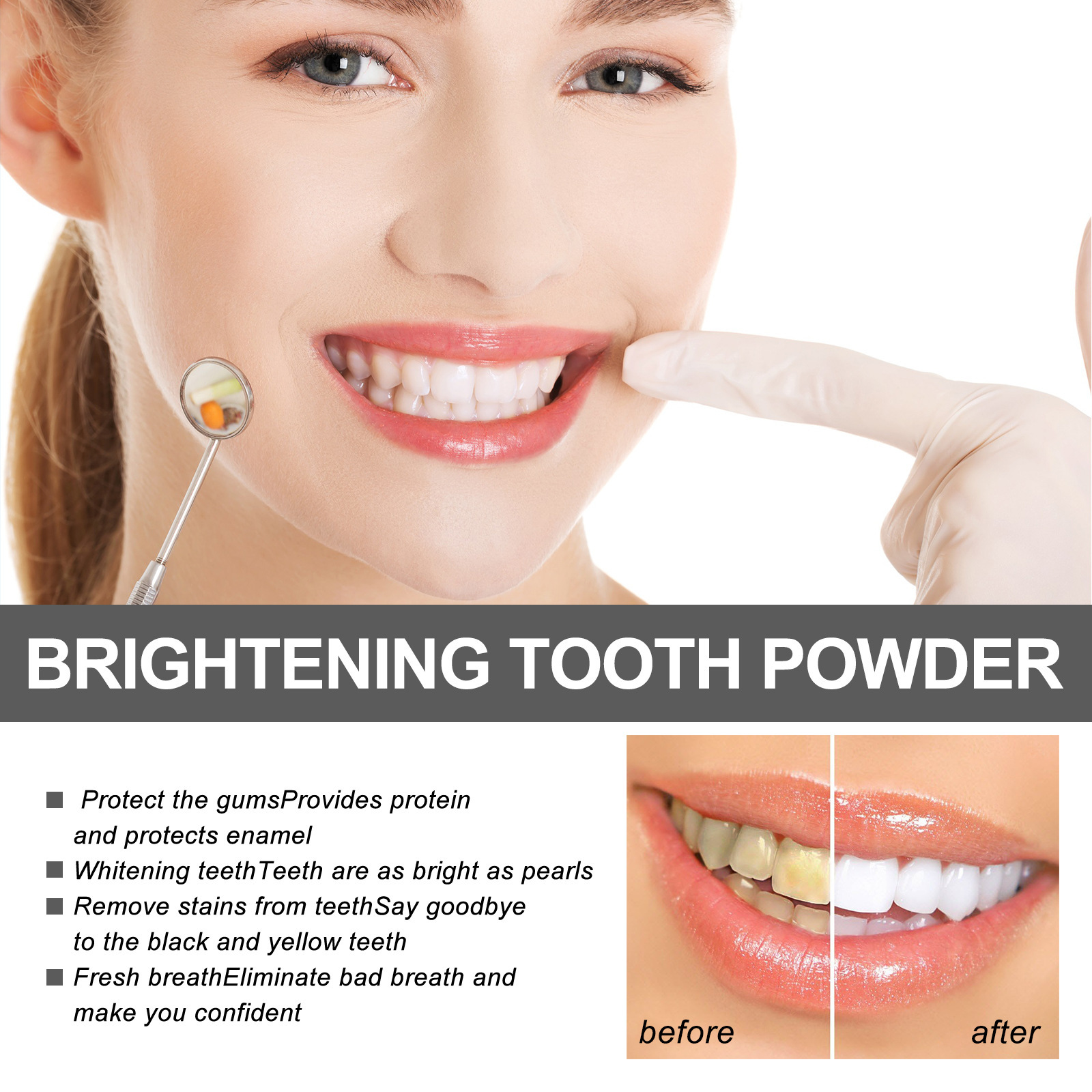 • Natural ingredients of bamboo charcoal teeth whitening powder including peppermint pearl extract and baking soda