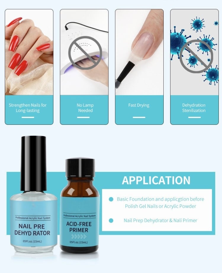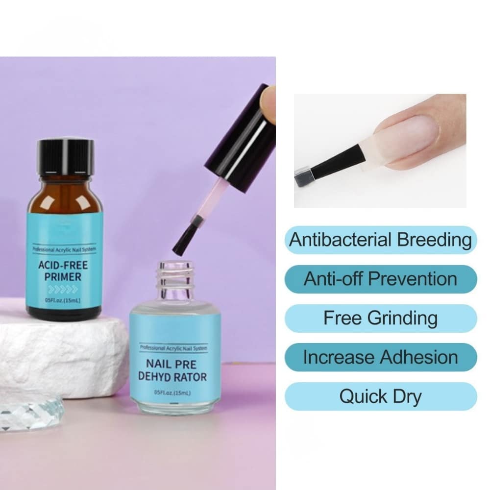 Get strong, long-lasting acrylic or gel nails with this essential 2-step nail prep kit. The Nail Pre-Dehydrator removes moisture and oils, while the Acid-Free Primer creates a powerful bond that prevents lifting and peeling.